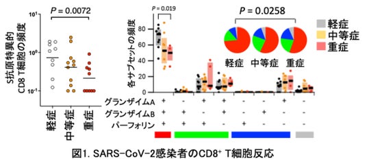 – 重症患者では、SARS-CoV-2感染細胞の除去に関わる抗原特異的CD8+ T細胞の頻度及び感染細胞を攻撃する因子の発現頻度がともに低く、これが重症化に関与していることが示唆されました。