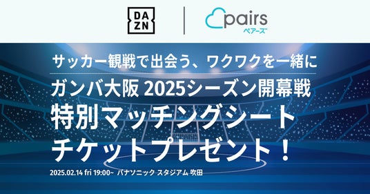 恋活・婚活マッチングアプリ「Pairs(ペアーズ)」を運営する株式会社エウレカ(本社:東京都港区、代表取締役CEO:山本⻯馬、以下 ペアーズ)は、スポーツ・チャンネル「DAZN(ダゾーン)」とコラボレーションして、2月14日のバレンタインデーに開催する「2025明治安田J1リーグ」のオープニングマッチ(対戦カード:ガンバ大阪 対 セレッソ大阪)の特別マッチングシート観戦チケットプレゼントキャンペーンをペアーズユーザー向けに実施すると発表しました。