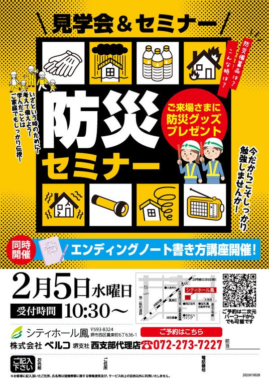 株式会社ベルコの運営する「シティホール鳳」では、2025年2月5日(水)に地域防災意識の向上を目的とした「防災セミナー」を開催いたします。本セミナーは、SDGs(持続可能な開発目標)の達成を目指し、災害時の準備や対応に関する具体的な知識を共有するとともに、地域コミュニティの強化を図るイベントです。