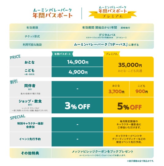 株式会社ムーミン物語(本社:埼玉県飯能市、代表取締役社長:小幡 匡志)は、2024年11月に実施された1デーパス料金改定を受け、2025年2月1日(土)より、ムーミンバレーパークのデジタル年間パスポートを新価格および、新しい特典内容で販売開始いたします。これに伴い、新たな特典が加わった「ムーミンバレーパーク 年間パスポート」に加え、より特別な体験をお楽しみいただける「ムーミンバレーパーク プレミアム年間パスポート」が新登場いたします。