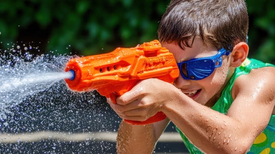 温水プールの中から2名の対戦。水鉄砲で的を狙います。35丁の水鉄砲を用意があるので、待っている間も練習用の的で思いっきり遊べます。