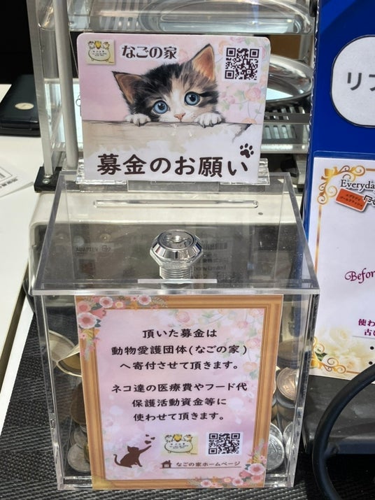また、毎月1回の譲渡会開催だけでなく、エブリデイゴールドラッシュ各店には、保護猫支援活動に対する募金箱が常設されており、支援活動に賛同くださったお客様より募金を頂いております。