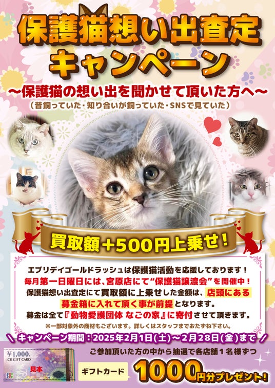 内容:店頭にお持ち頂いた商品の買取査定時に、“保護猫の想い出”をお話し頂き、商品査定価格にプラスアルファ500円上乗せして買い取りをさせて頂きます。その上乗せ買い取り500円を、店頭常設の保護猫募金箱へ募金頂いた方を対象に、抽選で、エブリデイゴールドラッシュ各店1名様ずつ(合計8名様)へ1000円分のJCBギフトカードをプレゼントさせて頂きます。