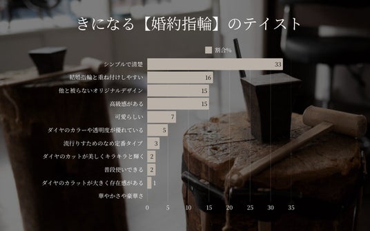 「シンプルで清楚」が圧倒的に人気で、次いで「結婚指輪との重ね付けしやすさ」や「オリジナルデザイン」が評価されています。一方、「華やかさや豪華さ」はほとんど重視されていないことがわかります。
