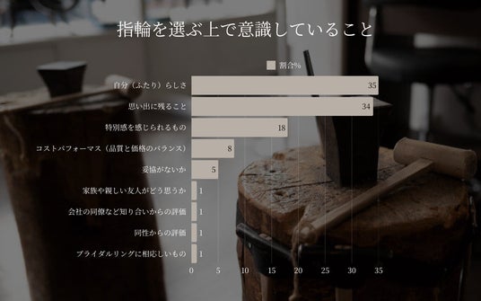 指輪選びで重視されるポイントとして、「自分(ふたり)らしさ」(35%)と「思い出に残ること」(34%)が最も高い割合を占めました。次いで、「特別感を感じられるもの」(18%)が支持を集めています。一方で、「コストパフォーマンス」(8%)や「妥協がないか」(5%)は比較的低く、「家族や友人の意見」や「会社・同性からの評価」はそれぞれ1%とほとんど影響していないことが分かりました。全体的に、個性や思い出を重視する傾向が強く、価格や他者の意見よりも、自分たちの価値観に合った指輪を選ぶ姿勢が顕著でした。