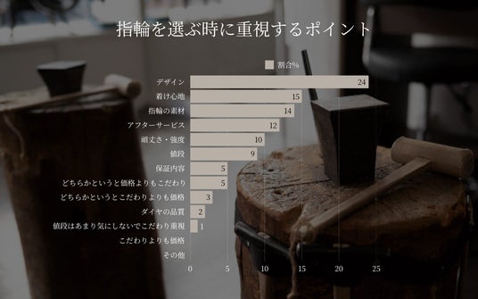 アンケート結果によると、指輪を選ぶ際に最も重視されるポイントは「デザイン」(24%)で、次いで「着け心地」(15%)、「指輪の素材」(14%)が続きました。「アフターサービス」(12%)や「頑丈さ・強度」(10%)も一定の支持を得ています。一方、「値段」(9%)や「保証内容」(5%)は比較的重視されていない傾向が見られます。全体的に、見た目や使用感に対するこだわりが強く、価格よりも品質や体験価値を重視する傾向が明らかになりました。