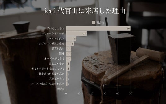 「icci代官山」に来店した理由として、最も多かったのは「手づくりできる」(50%)で、半数の顧客がこの点を重視していました。次いで「おしゃれなイメージ」(16%)、「デザインが良い」(8%)、「デザインの種類が豊富」(6%)が続きます。「品質が良い」「価格」「オーダーができる」はそれぞれ4%で同率。「親しみやすい」「セミオーダーが充実している」が3%、さらに「鑑定書の信頼度が高い」「高級感がある」「ルース(宝石)の品質が高い」は各1%と少数派でした。全体的に、手づくり体験やデザイン性を重視する傾向が顕著でした。