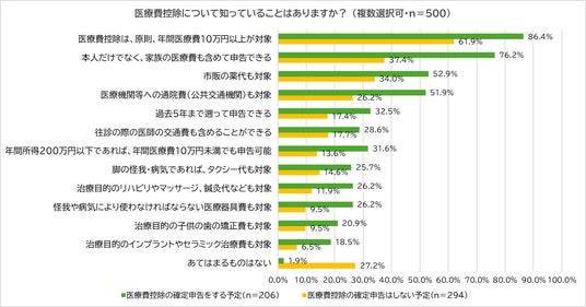医療費控除の確定申告をする予定・しない予定の人それぞれに「医療費控除について知っていることはあるか?」聞きました。医療費控除申告する・しないに関わらず、最多は「医療費控除は、原則、年間医療費10万円以上が対象」(する:86.4%、しない:61.9%)、次いで「本人だけでなく、家族の医療費も含めて申告できる」(する:76.2%、しない:37.4%)、「市販の薬代も対象」(する:52.9%、しない:34.0%)となりました。また、しない人の27.2%が「あてはまるものはない」と回答、全体的にする人に比べ、しない人は知見が浅い傾向にあります。