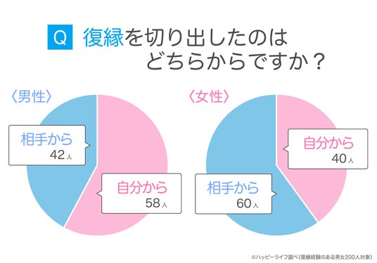 復縁経験者に「復縁を切り出したのはどちらからですか?」と聞いてみたところ、「自分から」と回答した男性は6割弱、女性は4割でした。