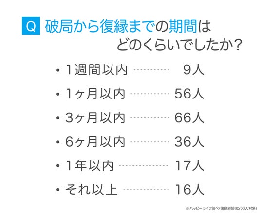 復縁経験者に「破局から復縁までの期間はどのくらいでしたか?」と聞いてみたところ、「3ヶ月以内」が最多回答でした。