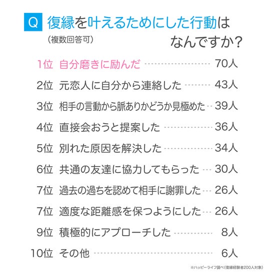 復縁経験者に「復縁を叶えるためにした行動はなんですか?」と聞いてみたところ、「自分磨きに励んだ」という回答が1位でした。