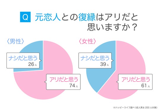 成人男女200人に「元恋人との復縁はアリだと思いますか?」と聞いてみたところ、「アリだと思う」と回答した男性は7割、女性は6割を超えました。
