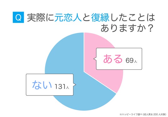 成人男女200人に「実際に元恋人と復縁したことはありますか?」と聞いてみたところ、「ある」と回答した人は69人、「ない」と回答した人は131人でした。
