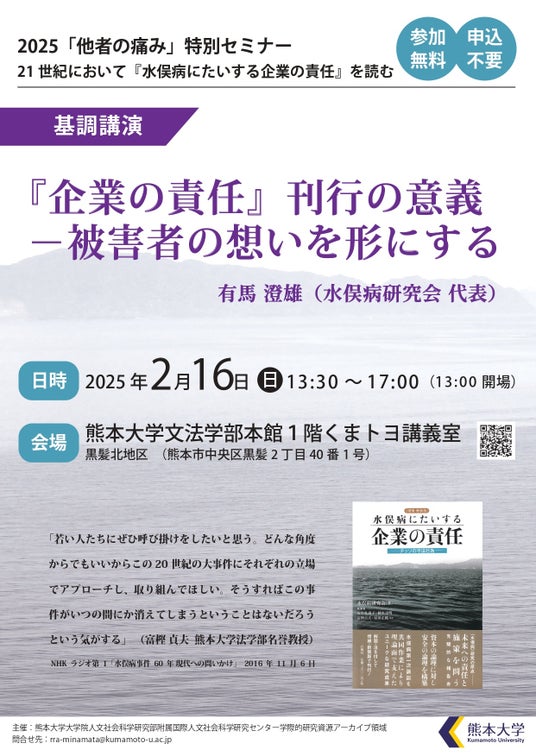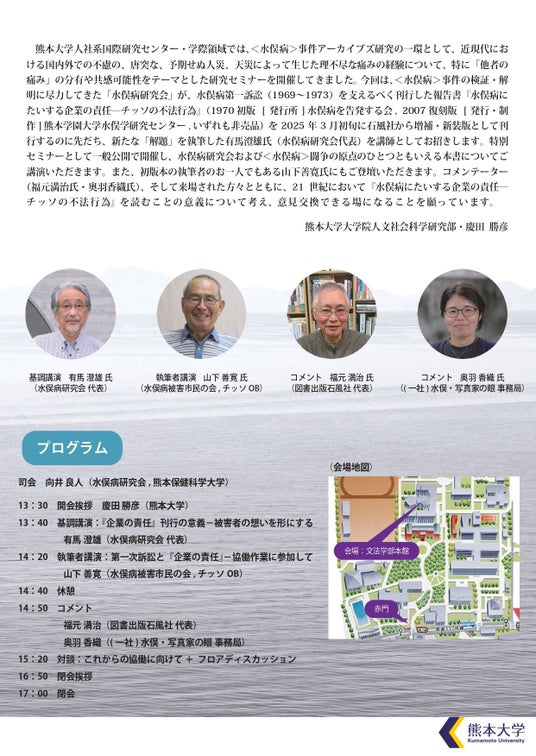 <水俣病>事件の検証・解明に尽力してきた「 水俣病研究会」が、水俣病第一訴訟(1969~1973)を支えるべく刊行した報告書『水俣病にたいする企業の責任―チッソの不法行為』(1970 初版・[発行所] 水俣病を告発する会、2007 復刻版・[発行・制作] 熊本学園大学水俣学研究センター 、いずれも非売品)を2025 年2 月下旬~3 月初旬に石風社から増補・新装版として刊行予定です。新たな「解題」を執筆した有馬澄雄氏(水俣病研究会代表)を講師としてお招きし、水俣病研究会および<水俣病>闘争の原点ともいえる本書刊行の意義について語っていただきます。熊本大学の名誉教授、富樫貞夫(法学部)および故丸山定巳(文学部)が本書の執筆陣に含まれている経緯もあり、国際人文社会科学研究センター ・学際的研究資源アーカイブ領域主催の特別セミナーとして一般公開で開催します。また、初版本の執筆者のお一人でもある山下善寛氏にもご登壇いただきます。