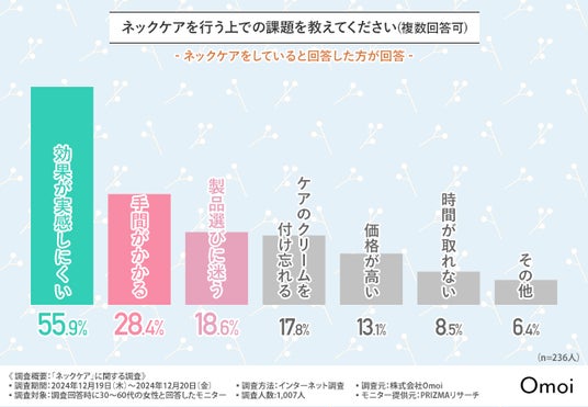 一方でネックケアに対し、まだ満足しきれていない点をうかがいました。「ネックケアを行う上での課題を教えてください(複数回答可)」と質問したところ、『効果が実感しにくい(55.9%)』が最も多く、『手間がかかる(28.4%)』『製品選びに迷う(18.6%)』が続きました。