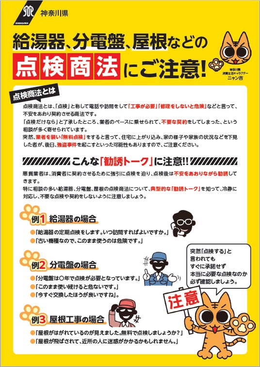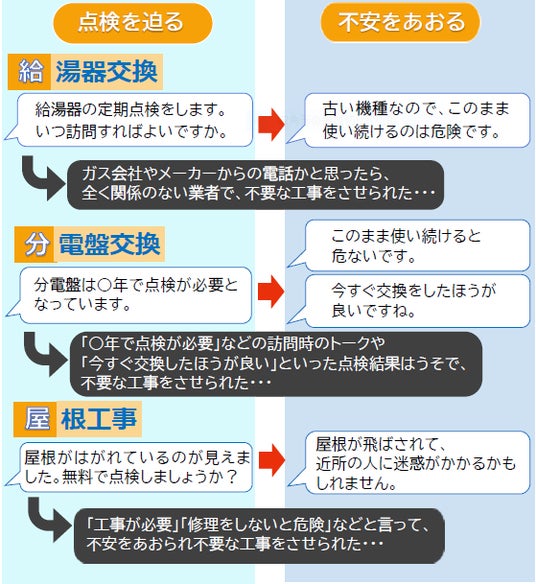 特に給湯器や分電盤の交換、屋根の工事に関する点検商法の相談が多い状況です。 また、突然、業者を装い「無料点検」をすると言って、住宅に上がり込み、家の様子や家族の状況などを下見した者が、後日、強盗事件を起こすといった可能性もありますので、ご注意ください。