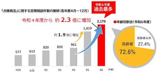 令和6年4月~12月の間に、県内の消費生活相談窓口に寄せられた「点検商法」に関する苦情相談件数は、令和4年度同期と比較した昨年度の約1.9倍を大きく上回り、今年度は約2.3倍に増加しています。また、苦情相談件数も、過去最多の2,179件となっています。