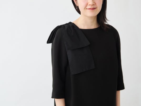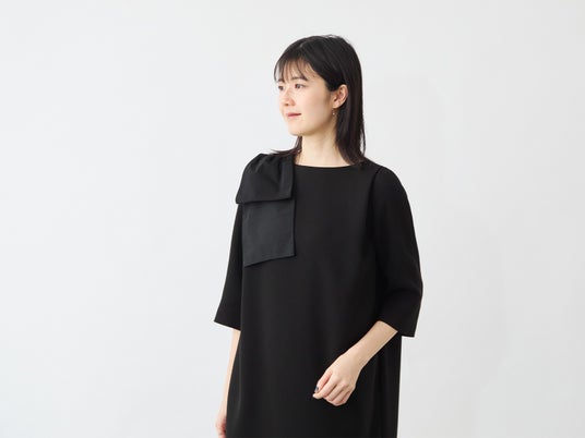 右肩にあしらわれた大きなリボンは、大人が上品に身につけられるワンポイントデザイン。