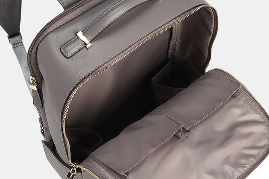 内装に、中身が飛び出さないファスナーポケットや、すばやくアクセスできるオープンポケット、傘や飲み物を立てて収納できるドリンクホルダーを配置。