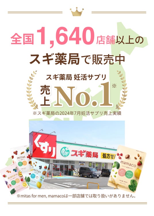 かねてよりmitas seriesの妊活期サプリ『mitas』妊娠期サプリ『mamaru』はスギ薬局にてお買い求めいただけましたが、産後のママこそ十分な栄養摂取が必要というお客様の想いや製品に共感していただき、産後期サプリ『mamaco』の採用が決定いたしました