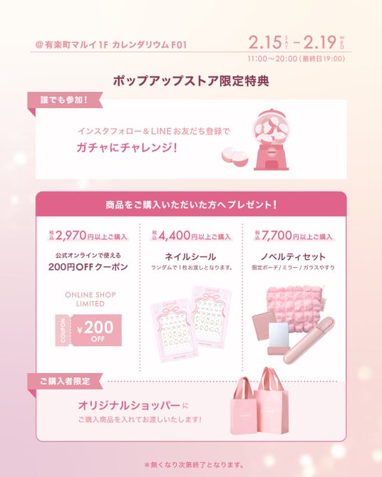 ブランド初となるPOP UPイベントでは、春の新色や10周年限定色をいち早く購入できるほか、通常公式オンラインショップでしか購入できないオンライン限定色を含むお好きなカラーを試し塗りできるタッチアップスペースもご用意。さらに、特別なキットやノベルティ、ガチャガチャなど、POP UPイベントならではのスペシャルイベントが盛りだくさんです。