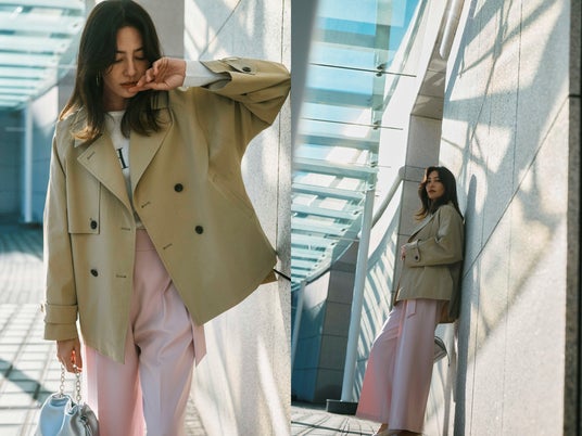 ポンチョのようなリラクシーなフォルムがきちんと感とラフさを両立してくれるトレンチコート。サッと羽織れる軽さながら、リッチ感はしっかりキープ。ショート丈なのでボリュームのあるボトム合わせもバランス良く決まります。