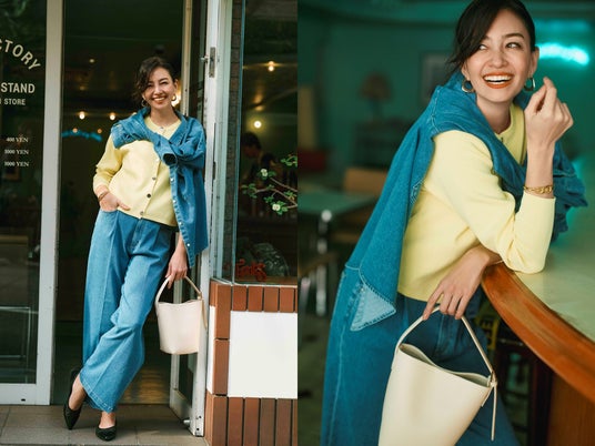 柔らかなストレッチ素材ながら、センタープレスや計算されたシルエットで大人を綺麗に魅せるデニム。デニムオンデニムもシックにまとまるスタイルで、差し色のイエローが一層春ムードを演出してくれます。