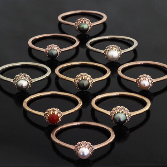 リング、ペンダント、ピアス。『ポンポネ ペルル』は身に着けたい場所に合わせてお選びいただけます。有機宝石ならではの、内側から滲み出るような色艶を、どこか懐かしいクラシカルな雰囲気で纏っていただけます。