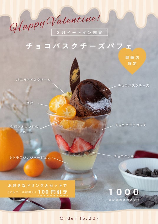 同時期2025年2月1日より期間限定パフェを販売いたします。昨年ご好評をいただいたパフェを、『バレンタイン限定』の濃厚チョコバスクチーズ×柑橘バージョンにしてお届けいたします。