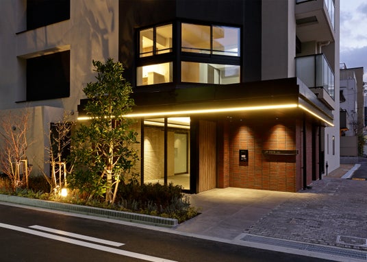 ・外観はグレー系の落ち着きのある色調とし、さらに外壁・ガラス手摺の色に変化をつけることにより周囲の環境に調和させました。建物のアイキャッチとして北西部角の2階から最上階までのコーナーサッシを採用し、スタイリッシュで上品な雰囲気となるようディレクションしました。