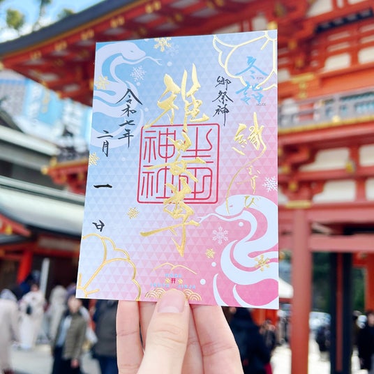 縁むすびの神である御祭神「稚日女尊」を中央に揮毫し、新たなる年を感じるよう左右には今年の干支「巳」を描き、冬らしいデザインと色合いで、清らかでおめでたい様子を表現した季節限定の御朱印です。