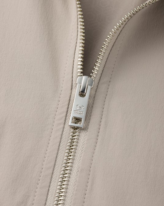 アンダーアーマーオリジナルの「STORM※」加工による撥水機能を施したブルゾン。ストレッチ性に優れたファブリックと、襟・肩部分に配したしなやかなリブにより、快適な着心地を実現しました。背面にはベンチレーションヨークを設け、通気性にも配慮。ファスナー引手はオリジナル仕様でコラボロゴ入り、さらに袖口にもコラボロゴ入りのシリコンネームをあしらい、細部までこだわりました。ヘムにはドローコードを内蔵しており、シルエットを自由にアレンジ可能です。