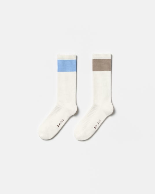 太目のラインが目を引くリブソックス。 伸縮性に優れたリブ編みにより、快適なフィット感を実現しています。さらに、底面にはパイル編みを採用し、心地よいクッション性を備えています。リブ部分には抗菌防臭加工を施した糸を使用しています。