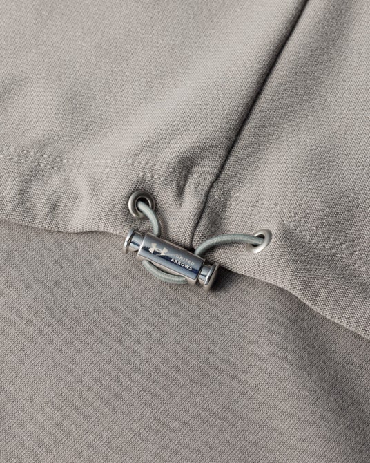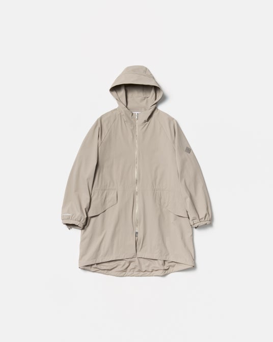 アンダーアーマーオリジナルの「STORM※」加工による撥水機能を施し、ミリタリー要素を取り入れたコート。ストレッチ性に優れた生地を使用し、快適な着心地を実現しました。背面にはベンチレーションヨークを配置し、通気性にも配慮しています。ウエストとヘムにはドローコードを内蔵し、シルエットの調整が可能。さらに、前裾にはコラボロゴのシリコンネームをあしらい、細部までこだわりました。