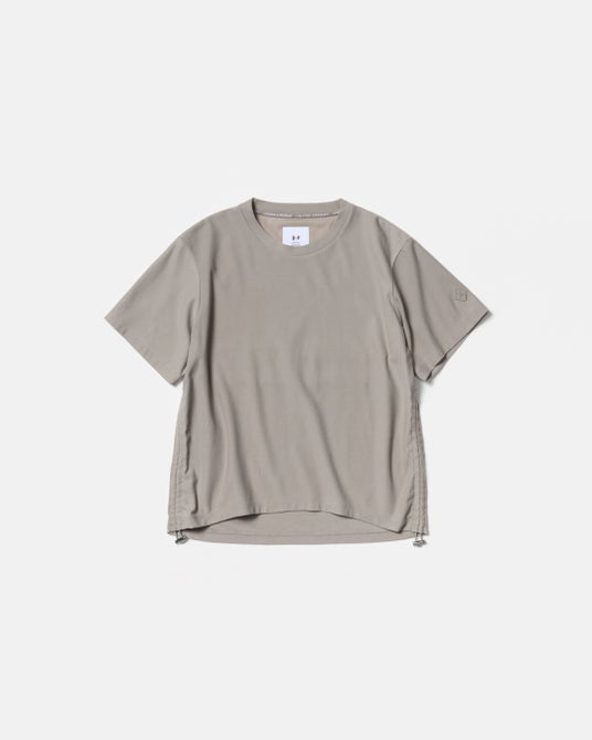 サイドにドローコードを配したクロップドTシャツ。ドローコードを調整することで丈のアレンジが可能です。素材には、糸の段階でかさ高性と弾力性を高めるATY加工を施し、ポリエステルの耐久性を持ちながら、コットンのようなナチュラルな風合いを実現しました。背中には通気性を高めるベンチレーションを配置し、機能性とデザイン性を両立しています。また、吸水速乾性や消臭機能も備えており、快適な着心地を提供します。