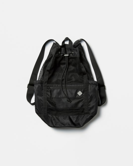 メッシュ素材をメインに使用したバックパック。上部のドローコードに加え、背面中央に配したファスナーからも荷物の出し入れが可能。