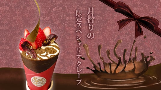 2月から始まる限定スペシャリテクレープは、高級ショコラブランド「ヴァローナ」のショコラをふんだんに使い、またショコラクッキー、パールクラッカン、アーモンドスライス と食感の変化を存分に楽しんでいただける多層構造にこだわった贅沢なクレープです。