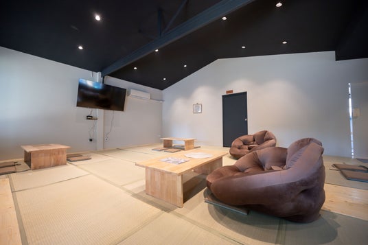 畳でゆっくりくつろぎながらご飯もいただけるエリア。日本のテレビも映ります。