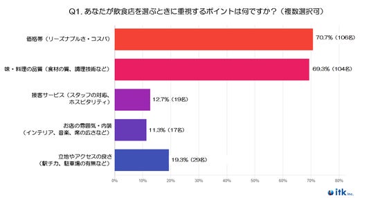 本調査では、飲食店を選ぶ際に重視されるポイントとして「価格帯(コスパ)」と「味・料理の品質」が特に高い支持を得ました。