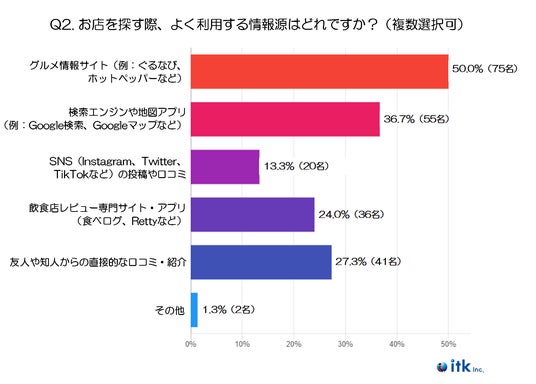 加えて、お店を探す際にはグルメ情報サイトや検索エンジン、友人・知人からの口コミなど、複数の情報源を併用する傾向が見られます。