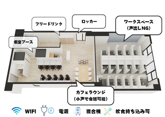 ■設備:Wi-Fi/電源/フリードリンク/複合機/TELブース/シェアライブラリー