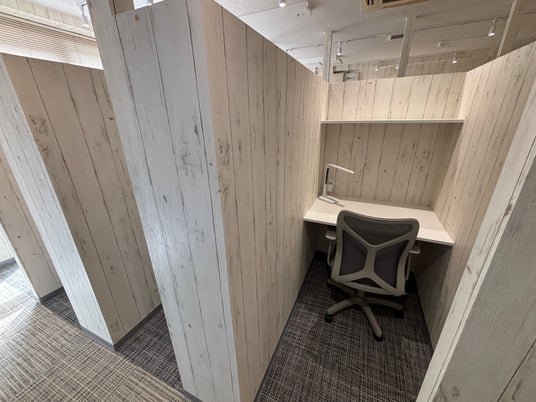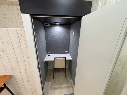 店内には2台の個室ブースを設けております。個室となっておりますので、ビデオ会議や語学の音読練習をされる際も安心してご利用いただけます。会員様は2時間まで無料、W E Bから予約が可能で、アポイントにも対応します。