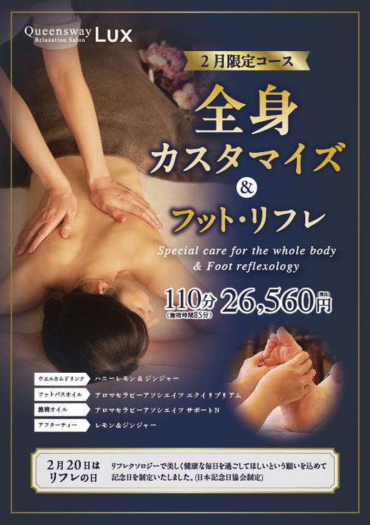 Queenswayのハイクラスサロンという位置づけであるQueenswayLUXが「全身カスタマイズコース&フット・リフレ」をオススメコースとしてご提供いたします。