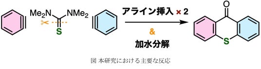 アライン中間体とチオ尿素の反応によって、チオキサントンを簡便に合成できる新たな手法を開発しました。