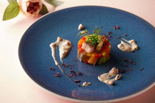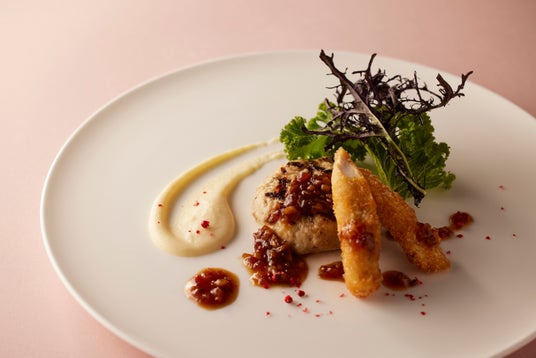 前菜には、春に旬を迎える鰹と、彩り鮮やかな春野菜をコンソメゼリーに閉じ込めたアスピックゼリーをはじめとする、季節感溢れるメニューを週替わりでご用意します。メインディッシュには、高知県の特産品である“はちきん地鶏”を、香ばしくグリルしたパテやスティックフライにし、生姜の風味豊かな和風テイストのソースと合わせて味わう「はちきん地鶏のパテグリルとスティックフライ 生姜ソース」など、シェフこだわりのラインアップをご用意しました。