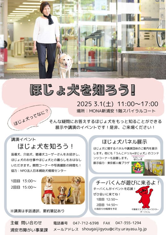 千葉県浦安市に補助犬ユーザーさんがやってくる!身体障害者補助犬についての周知イベント「ほじょ犬を知ろう!」を2025年3月1日(土)、MONA新浦安にて開催します。