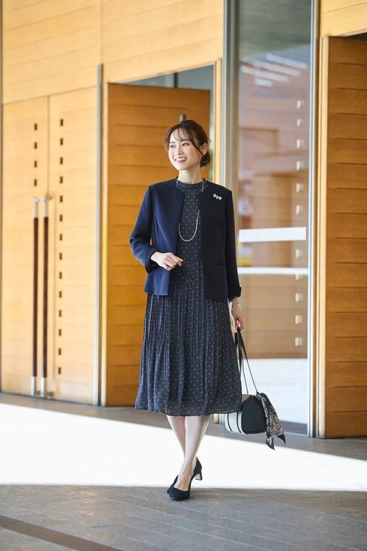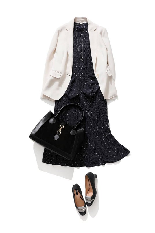 きちんとしたいあらゆる時に信頼できるネイビーのワンピース。同色のネイビージャケットとのスタイリングで、元からセットだったのかと見まごう完成度に。細かいドット柄なので、無地ほど地味見えしないのが嬉しいポイント。