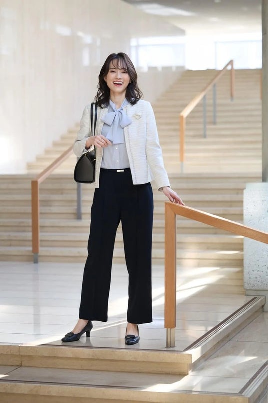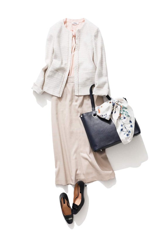 お仕事シーンではテーラードジャケットを羽織って、シンプルに品よく。ネイビーとも相性が良く春らしいアイボリーを選んであげると、堅くなりすぎずやわらかい印象で着こなせます。