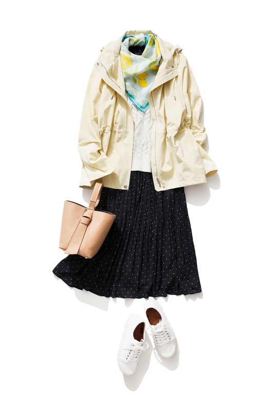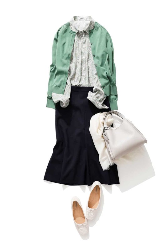 絶対に着回せるネイビーのスカートはセンタータック入りのため、シンプルな着こなしにニュアンスを与えてくれる1枚。春らしいプリントブラウスとカーディガンのコーディネートで、新しい季節にぴったりのおでかけコーデの完成。