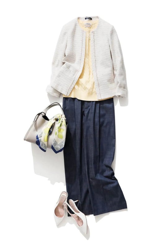 クラシカルなツィードジャケットは単品使いすると、ジャケット初心者でも着こなしやすい優秀アイテム。甘くなり過ぎないよう、さじ加減が重要です。爽やかなサックスのボウタイブラウス+ネイビーのワイドパンツを装備して、媚びすぎないハンサムなセレモニースタイルに。